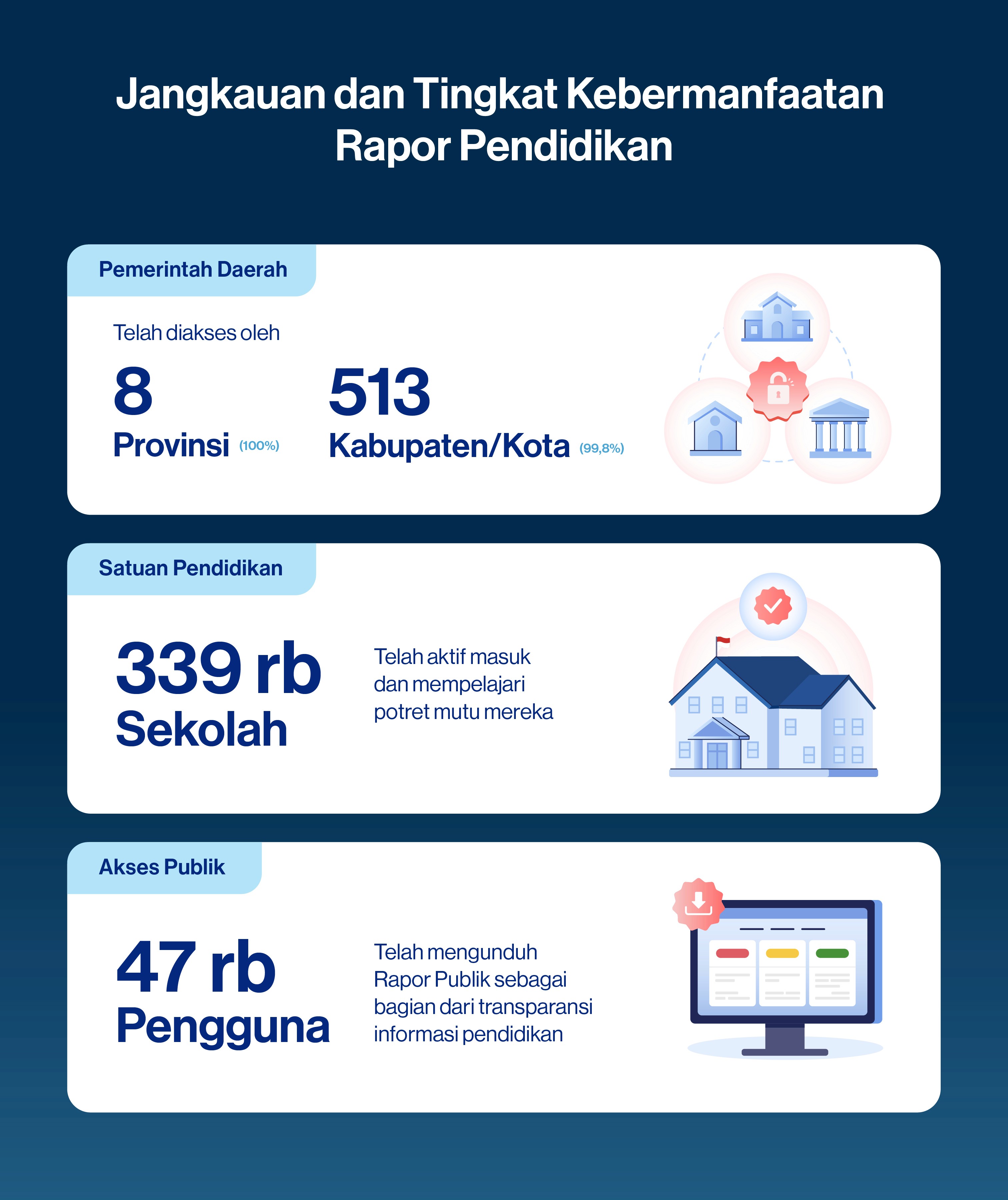 Hingga saat ini, pemanfaatan Rapor Pendidikan telah menjangkau hampir seluruh pelosok negeri dan menjadi rujukan utama bagi berbagai pihak, mulai dari pemerintah daerah, satuan pendidikan, hingga publik luas.